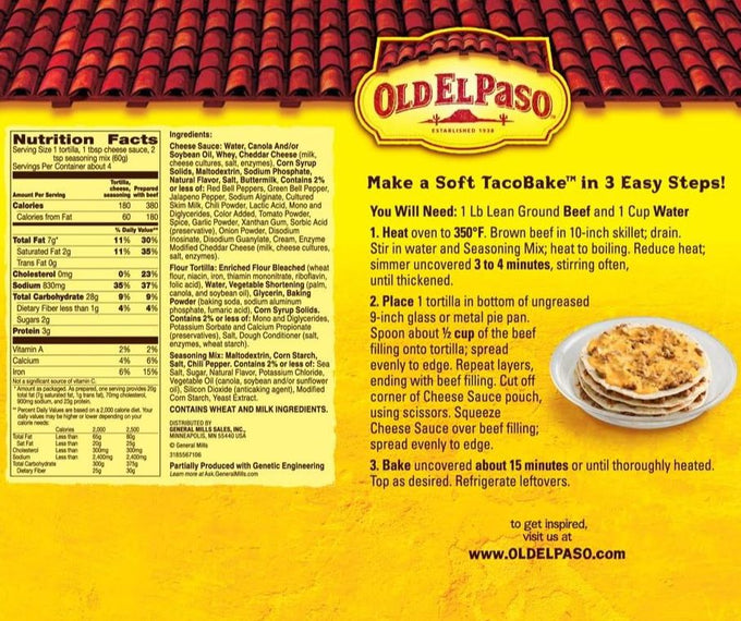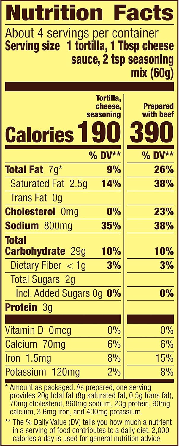 Ingredients: Flour Tortillas: Enriched Flour Bleached (Wheat Flour, Niacin, Iron, Thiamin Mononitrate, Riboflavin, Folic Acid), Water, Palm Oil, Glycerin. Contains 2% Or Less Of: Baking Powder (Sodium Aluminum Phosphate, Baking Soda), Mono And Diglycerides, Salt, Potassium Sorbate And Calcium Propionate (Preservatives), Fumaric Acid, Hydrogenated Vegetable Oil (Soybean, Palm, And/or Cottonseed Oil), Dough Conditioner (Salt, Wheat Starch, Enzymes).cheese Sauce: Water, Canola And/or Soybean Oil, Whey, Cheddar Cheese (Milk, Cultures, Salt, Enzymes), Corn Syrup Solids, Maltodextrin, Sodium Phosphate, Natural Flavor, Salt. Contains 2% Or Less Of: Buttermilk, Jalapeno Pepper, Red Bell Pepper, Green Bell Pepper, Sodium Alginate, Cultured Nonfat Milk, Chili Powder, Lactic Acid, Color Added (Annatto And Paprika Extract), Mono And Diglycerides, Tomato Powder, Spice, Garlic Powder, Xanthan Gum, Sorbic Acid (Preservative), Onion Powder, Disodium Inosinate, Disodium Guanylate, Cream, Enzyme Modified Cheddar Cheese (Milk, Cultures, Salt, Enzymes).seasoning Mix: Corn Starch, Maltodextrin, Salt, Spice. Contains 2% Or Less Of: Sugar, Vegetable Oil (Canola And/or Soybean Oil), Red Chili Pepper, Onion Powder, Silicon Dioxide (Anticaking Agent), Natural Flavor, Garlic Powder.