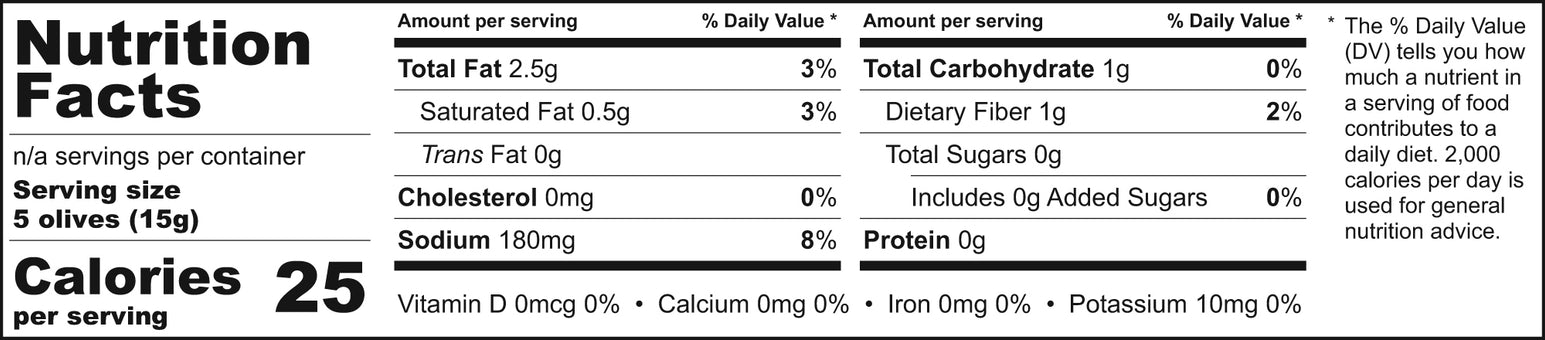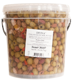 Ingredients: Olives, Water, Yellow And Red Bell Pepper Strips, Garlic, Sea Salt, Sunflower Oil, Spices, Lactic Acid.