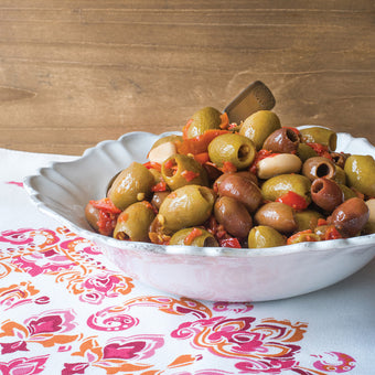 A summer afternoon visit to an outdoor market provides the inspiration for this delightful mix of olives, aromatic herbs, whole garlic cloves and sweet red and yellow peppers. The flavor profile is sweet, garlicky and savory, and we love to toss it into couscous with fresh Parmigiano-Reggiano.