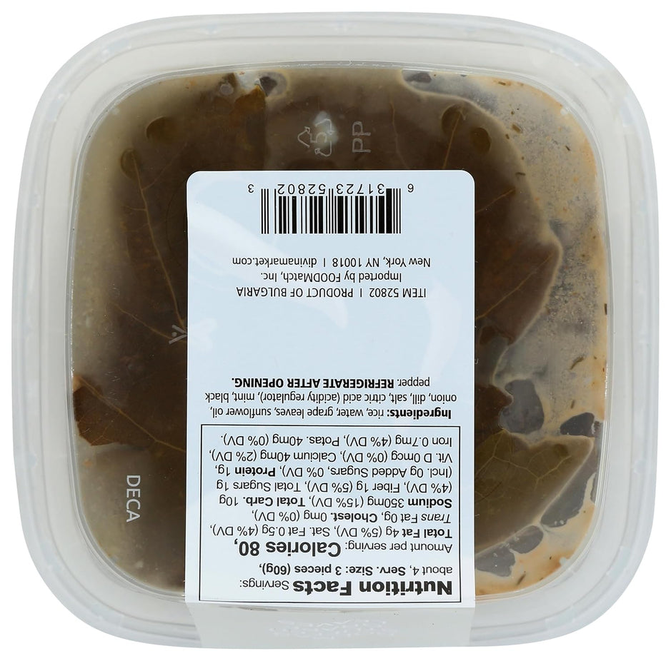 Ingredients: rice, water, grape leaves, sunflower oil, onion, dill, salt, citric acid (acidity regulator), mint, black pepper.