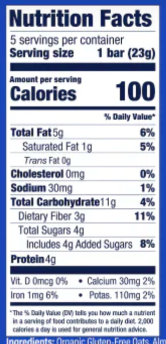 Ingredients: Organic Gluten-free Oats, Almonds, Honey, Almond Butter, Tapioca Fiber, Chocolate Chips, Cage-free Egg Whites, Cacao Powder, Vanilla Extract, Sea Salt. Contains: Almonds, Eggs.
