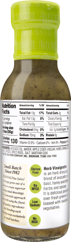 Ingredients: Avocado Oil, Water, Apple Cider Vinegar, Honey, Granulated Garlic, Spices, Dried Basil, Salt, Xanthan Gum.