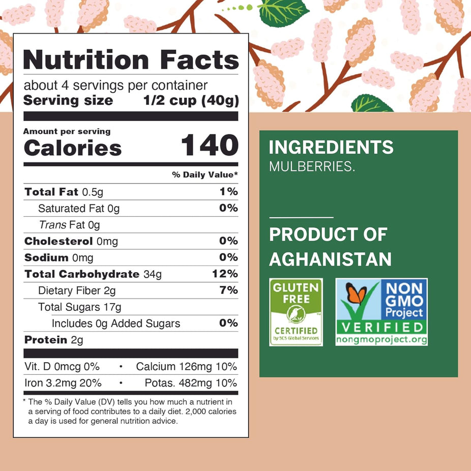 Ziba Foods brings you naturally sweet and crunchy Dried White Mulberries from the base of Afghanistan’s Hindu Kush mountains.