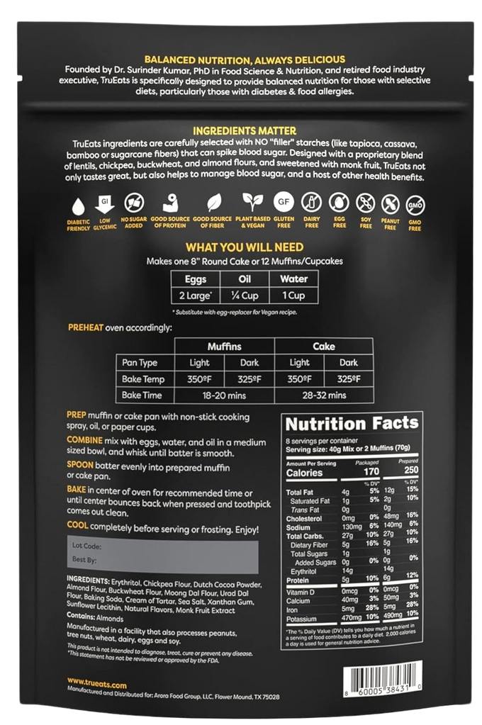 Ingredients: Erythritol, Chickpea Flour, Dutch Cocoa Powder, Almond Flour, Buckwheat Flour, Moong Dal Flour, Urad Dal Flour, Baking Soda, Cream Of Tartar, Sea Salt, Xanthan Gum, Sunflower Lecithin, Natural Flavors, Monk Fruit Extract