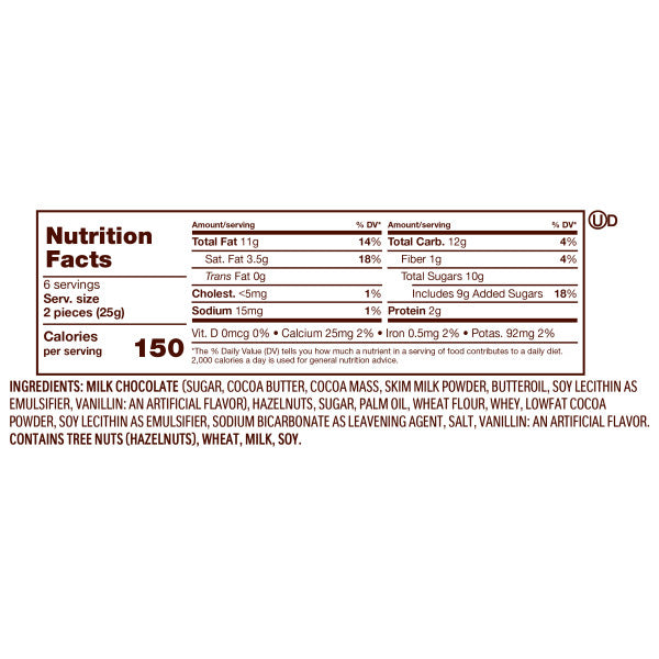 Ingredients: Milk Chocolate (Sugar, Cocoa Butter, Cocoa Mass, Skim Milk Powder, Butteroil, Lecithin As Emulsifier, Vanillin: An Artificial Flavor), Hazelnuts, Sugar, Palm Oil, Wheat Flour, Whey, Lowfat Cocoa Powder, Lecithin As Emulsifier, Sodium Bicarbonate As Leavening Agent, Salt, Vanillin: An Artificial Flavor.