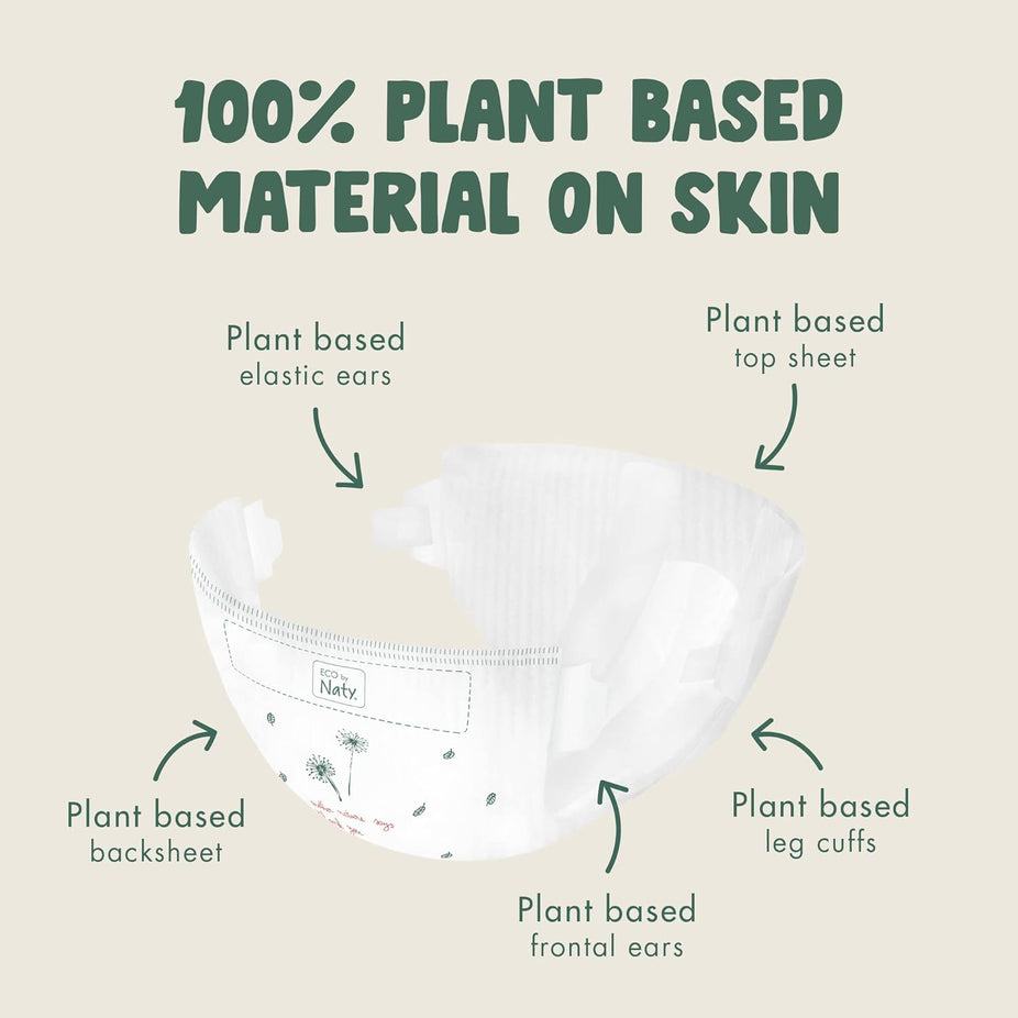 Ingredients: Inner Non woven - Plant-based PE Non woven, Sides protecting from leakage - Plant-based PE Non woven, Elastic Ears - Plant-based PE Non woven covering elastic film, Frontal ear - Plant-based, Back Sheet - Plant-based PE Non Woven and breathable barrier from plant based PE, Frontal tape - PE Nonwoven, Tape - PP.