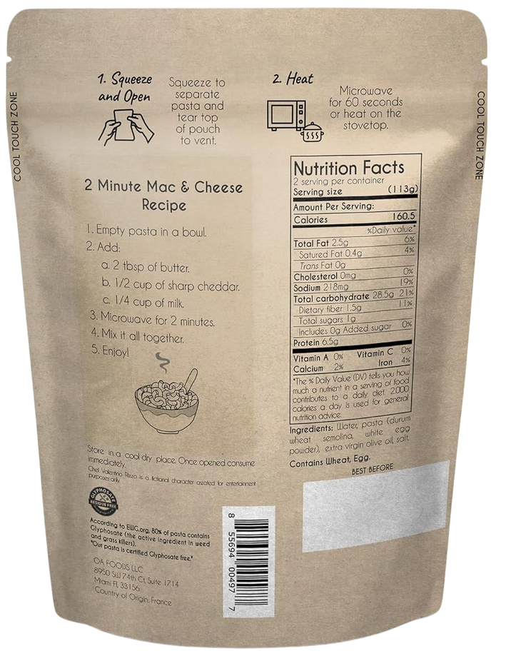 Ingredients: Water, Pasta (Durum Wheat Semolina, White Egg Powder), Extra Virgin Olive Oil, Salt.