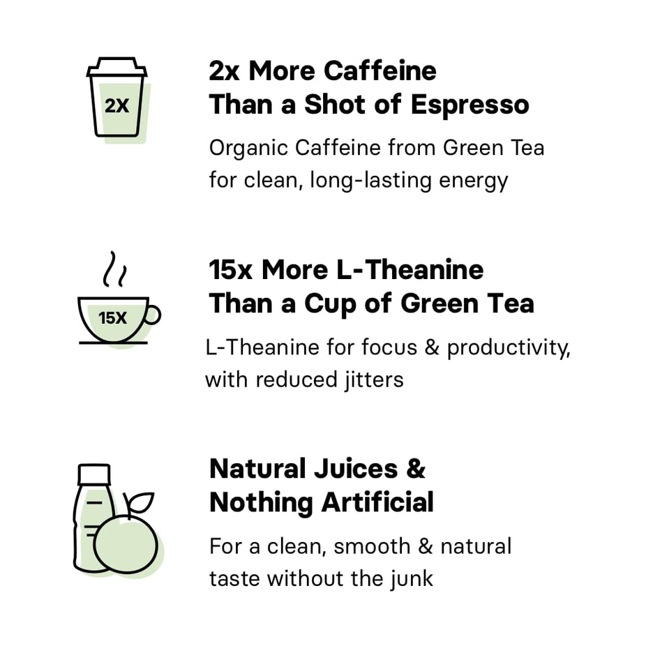 - Clean energy boost: Provides smooth, sustained energy with 2x more caffeine than a shot of espresso, sourced from organic green tea.