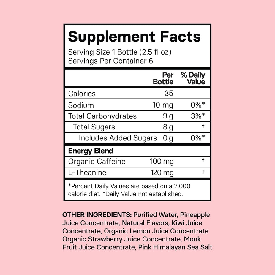 Ingredients: Purified Water, Pineapple Juice Concentrate, Natural Flavors, Kiwi Juice Concentrate, Organic Lemon Juice Concentrate, Organic Strawberry Juice Concentrate, Monk Fruit Juice Concentrate, Pink Himalayan Sea Salt.