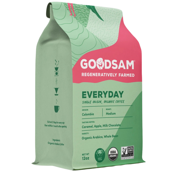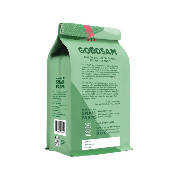 GoodSAM's Everyday Organic Coffee Beans are sourced from the indigenous tribes in Sierra Nevada de Santa Marta, Colombia. The coffee is grown on sacred ground at an altitude of 4,340 feet. Tasting Notes: Caramel, Apple & Milk Chocolate.