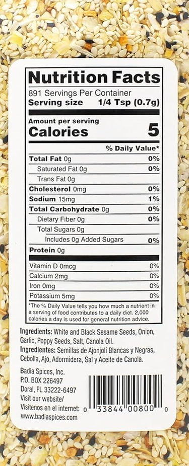 Ingredients: White and Black Sesame Seeds, Onion, Garlic, Poppy Seeds, Salt, and Canola Oil.