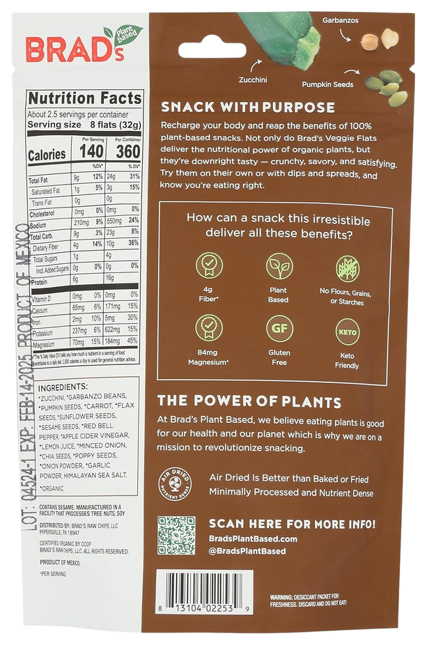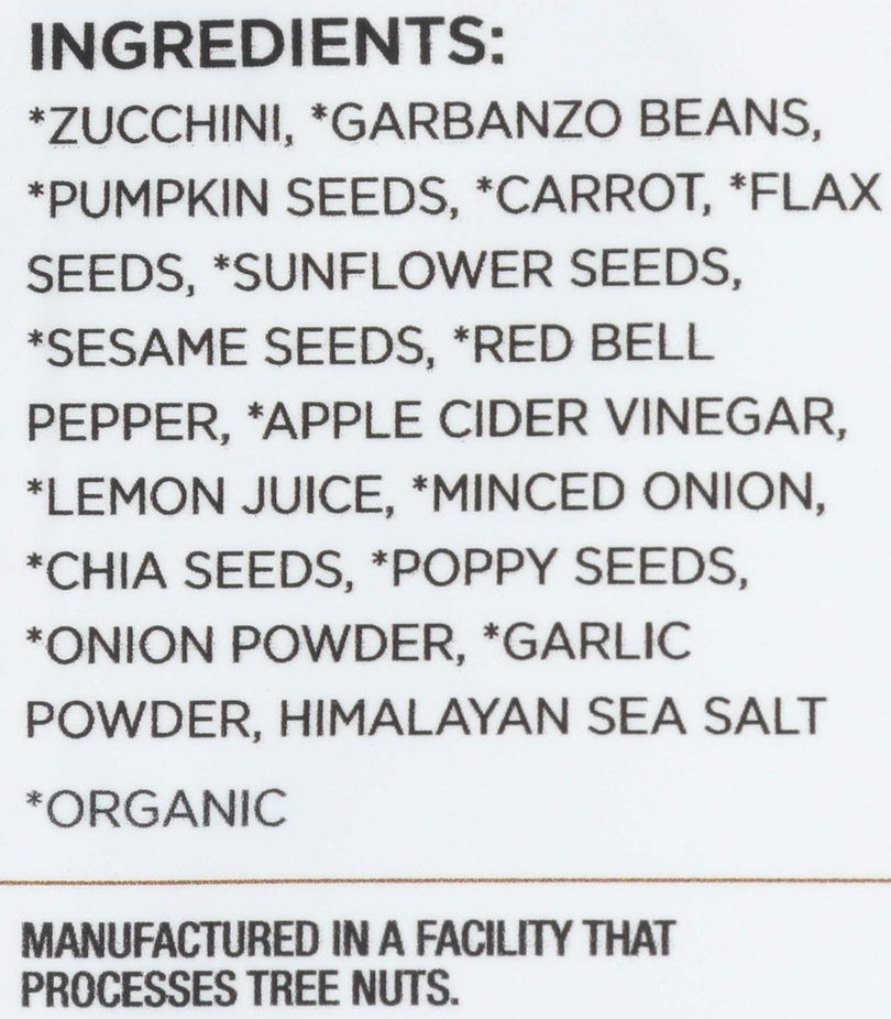 Ingredients: Zucchini***garbanzo Beans***pumpkin Seeds***carrot***flax Seeds***sunflower Seeds***sesame Seeds***red Bell Pepper***apple Cider Vinegar***lemon Juice***minced Onion***chia Seeds***poppy Seeds***onion Powder***garlic Powder***himalayan Sea Salt.