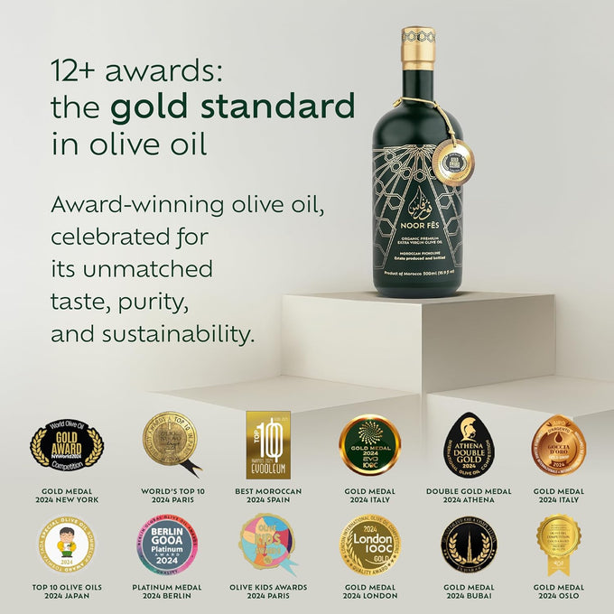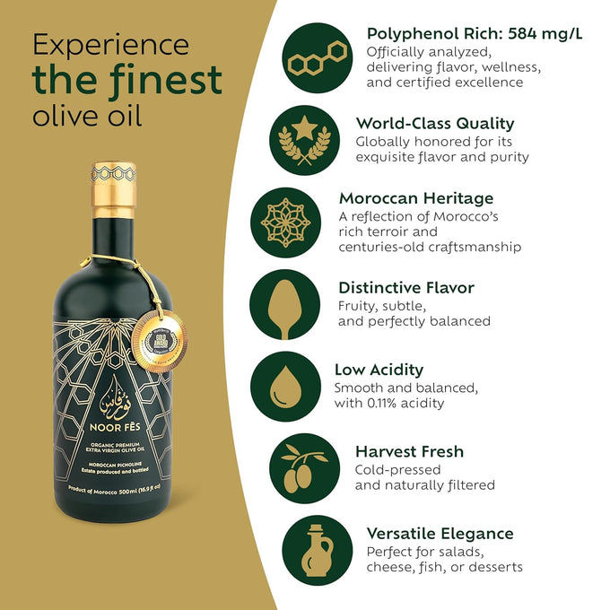 Noor Fes is a Moroccan brand celebrated for crafting premium olive oils using traditional methods and organic practices. Noor Fes Extra Virgin Olive Oil is a cold-pressed, award-winning oil made from hand-harvested Picholine olives, prized for their bold, fruity flavor and exceptionally low acidity.