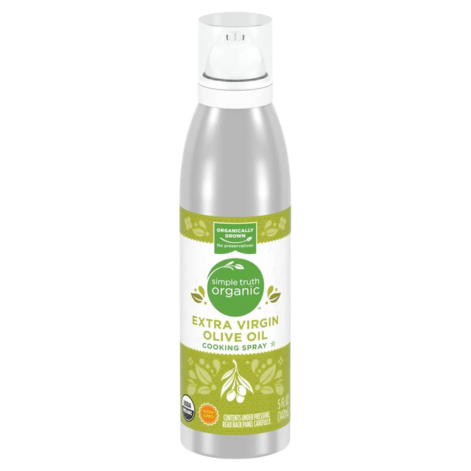 Simple Truth Organic Extra Virgin Olive Oil Cooking Spray is a cooking spray made from organic extra virgin olive oil and organic soy lecithin. It's a non-GMO, USDA organic, vegan, and gluten-free option for cooking. The spray is also free from preservatives and artificial flavors, and it's kosher certified.
