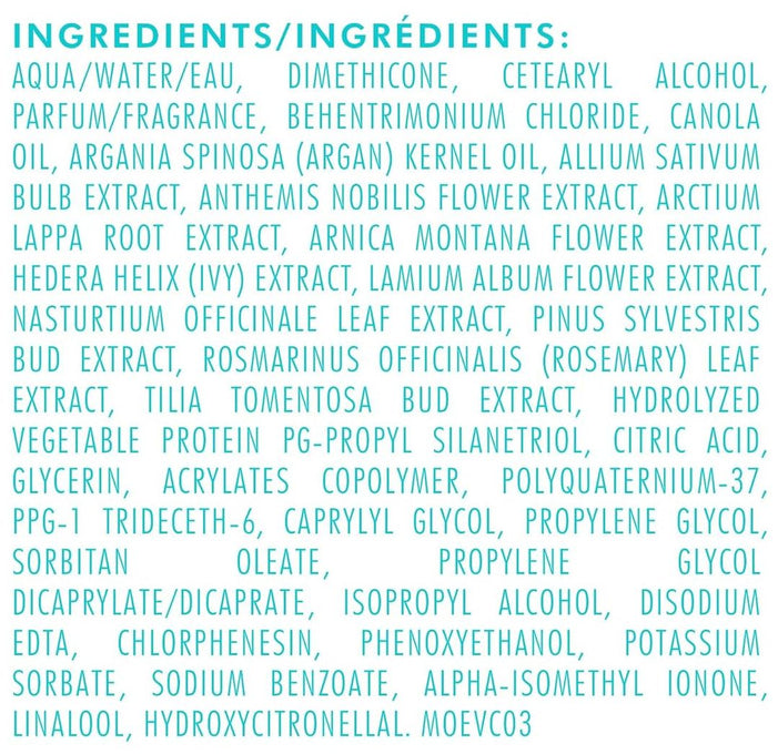 Ingredients: Aqua/Water/Eau, Dimethicone, Cetearyl Alcohol, Parfum/Fragrance, Behentrimonium Chloride, Canola Oil, Argania Spinosa (Argan) Kernel Oil, Allium Sativum Bulb Extract, Anthemis Nobilis Flower Extract, Arctium Lappa Root Extract, Arnica Montana Flower Extract, Hedera Helix (Ivy) Extract, Lamium Album Flower Extract, Nasturtium Officinale Leaf Extract, Pinus Sylvestris Bud Extract, Rosmarinus Officinalis (Rosemary) Leaf Extract, Tilia Tomentosa Bud Extract, Hydrolyzed Vegetable Protein Pg-Propyl Silanetriol, Citric Acid, Glycerin, Acrylates Copolymer, Polyquaternium-37, Ppg-1 Trideceth-6, Caprylyl Glycol, Propylene Glycol, Sorbitan Oleate, Propylene Glycol Dicaprylate/Dicaprate, Isopropyl Alcohol, Disodium Edta, Chlorphenesin, Phenoxyethanol, Potassium Sorbate, Sodium Benzoate, Alpha-Isomethyl Ionone, Linalool, Hydroxycitronellal.