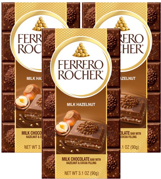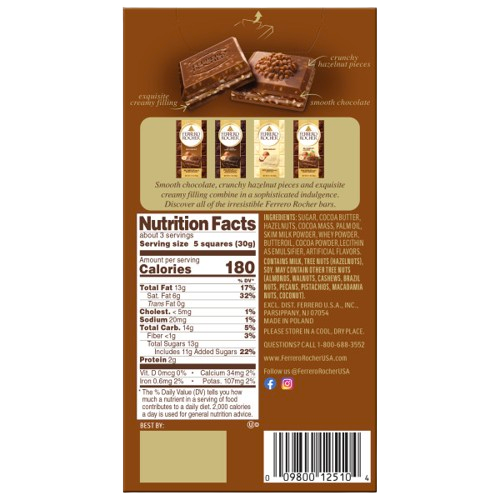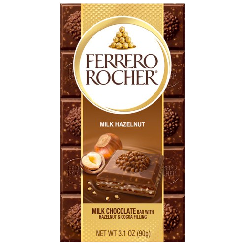 The special taste of Ferrero Rocher now comes in bars for everyday enjoyment. With irresistible layers of texture and flavor, the Ferrero Rocher Milk Chocolate Hazelnut Bar is far from ordinary: enjoy the taste of smooth milk chocolate mixed with crunchy hazelnut pieces combined with an exquisite creamy filling with hazelnuts. Made with great attention to detail, each Ferrero Rocher bar features creamy chocolate—milk, dark or white—carefully crafted with selected ingredients. Indulge your sense and tantalize your taste buds—this is an experience to remember. Each Ferrero Rocher bar is made from the highest-quality ingredients and wrapped in gold foil inside a box to protect the taste and quality of the bar. Discover all of the irresistible Ferrero Rocher® premium chocolate bars and make any day a reason to celebrate.