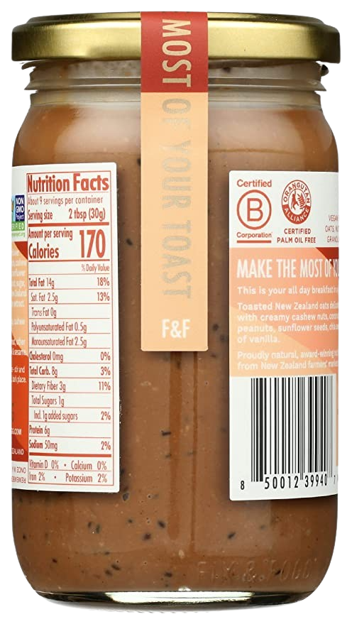 A beautifully balanced butter made with toasted oats, cashew nuts, coconut, sunflower seeds, chia seeds, and peanuts. With a hint of sweetness, a creamy base, and loaded with toasty texture, Oaty Nut Butter is your all-day breakfast in a jar.