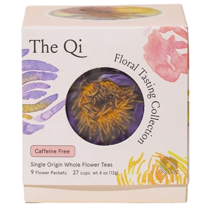 The Qi Floral Tasting Collection offers a stunning variety box of three whole flower teas, creating a luxurious and calming garden-to-cup ritual.