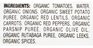 Ingredients: Organic Tomatoes, Water, Organic Onions, Organic Sweet Potato Puree, Organic Red Lentils, Organic Carrots, Organic Red Peppers, Organic Parsnip Puree, Organic Olive Oil, Organic Rutabaga Puree, Organic Leeks, Organic Spices.
