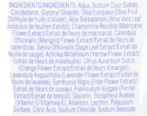 Ingredients: Aqua, Sodium Coco Sulfate, Cocamidopropyl Betaine, Decyl Glucoside, Sodium Chloride, Olea Europaea (Olive) Fruit Oil, Aloe Barbadensis Leaf Juice, Chamomilla Recutita (Matricaria) Flower Extract, Calendula Officinalis (Marigold) Flower Extract, Salvia Officinalis (Sage) Leaf Extract, Achillea Millefolium (Yarrow) Flower Extract, Citrus Aurantium Dulcis (Orange) Flower Extract, Lavandula Angustifolia (Lavender) Flower Extract, Sambucus Nigra (Elder) Flower Extract, Foeniculum Vulgare (Fennel) Seed Extract , Glycerin, Tocopheryl Acetate (Vitamin E), Allantoin, Lecithin, Glycol Stearate, Phenoxyethanol, Potassium Sorbate, Sodium Benzoate, Citric Acid
