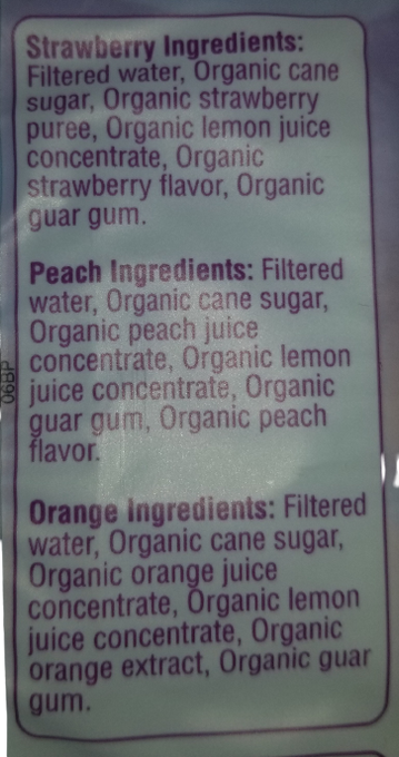 Peach Ingredients: Filtered water, Organic cane sugar, Organic peach juice concentrate, Organic lemon juice concentrate, Organic guar gum, Organic peach flavor.