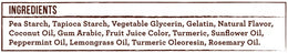 Ingredients: Tapioca Starch, Pea Starch, Vegetable Glycerin, Water, Gelatin, Natural, Flavor, Fruit Juice Color, Coconut Oil, Sunflower Seed Lecithin, Turmeric Spice, Peppermint Oil, Lemongrass Oil, Rosemary Oil.