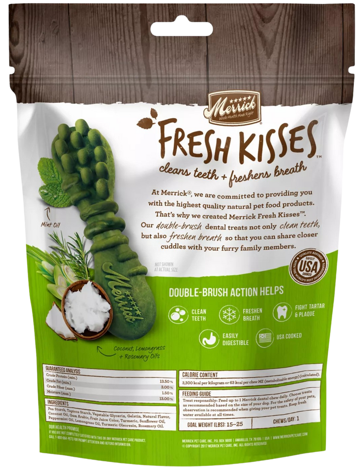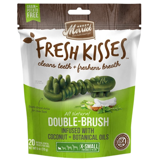 Give your small dog Merrick Fresh Kisses Coconut XS Brush treats and enjoy fresher cuddles and cleaner smiles.