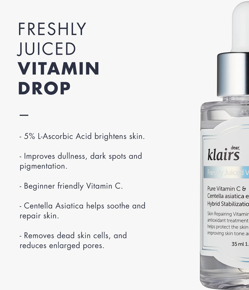 Dear, Klairs Freshly Juiced Vitamin Drop is a powerful vitamin C serum that revitalizes and brightens your skin while targeting multiple skin concerns.
