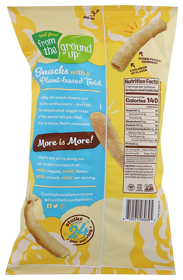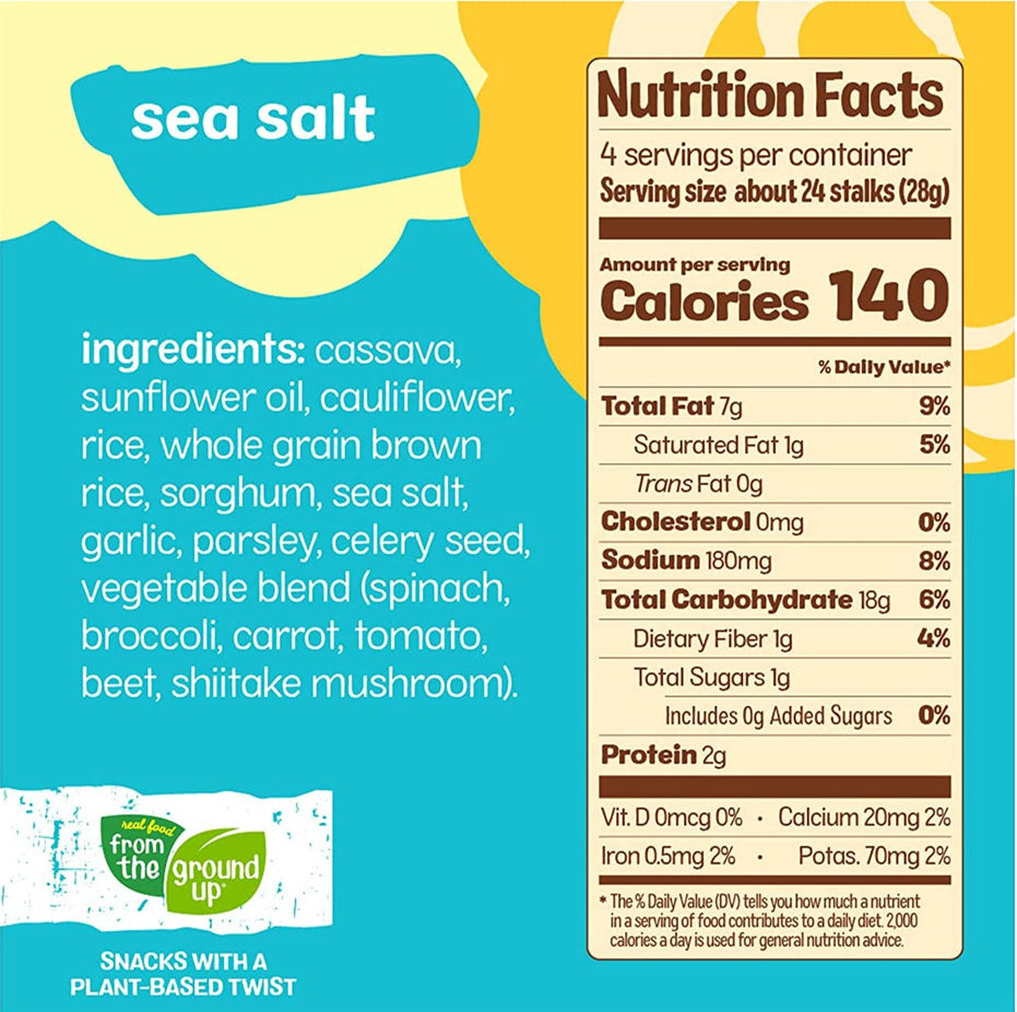Ingredients: Cassava, Sunflower Oil, Cauliflower, Rice, Whole Grain Brown Rice, Sorghum, Sea Salt, Garlic, Salt, Parsley, Celery Seed, Vegetable Blend (Spinach Broccoli, Carrots, Tomato, Beet, Shiitake Mushrooms).