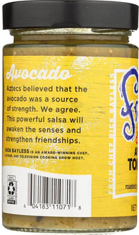 Ingredients: Fire-Roasted Tomatillos, Filtered Water, Fire-Roasted Tomatoes, Avocado, Roasted Onions, Roasted Garlic, Salt, Cilantro, Fire-Roasted Serrano Peppers, Cane Sugar, Extra Virgin Olive Oil, Xanthan Gum.