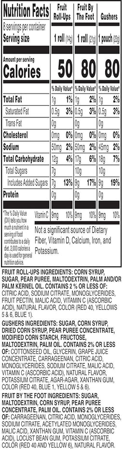 Ingredients: Fruit Roll-ups Ingredients: Corn Syrup, Sugar, Pear Puree, Maltodextrin, Palm And/or Palm Kernel Oil. Contains 2% Or Less Of: Citric Acid, Sodium Citrate, Monoglycerides, Fruit Pectin, Malic Acid, Vitamin C (Ascorbic Acid), Natural Flavor, Color (Red 40, Yellows 5 & 6, Blue 1). Fruit By The Foot Ingredients: Sugar, Maltodextrin, Corn Syrup, Pear Puree, Palm And/or Palm Kernel Oil. Contains 2% Or Less Of: Citric Acid, Carrageenan, Monoglycerides, Sodium Citrate, Malic Acid, Xanthan Gum, Vitamin C (Ascorbic Acid), Locust Bean Gum, Potassium Citrate, Color (Red 40, Yellow 6, And Blue 1), Natural Flavor. Gushers Ingredients: Corn Syrup, Sugar, Pear Puree, Modified Corn Starch, Fructose, Maltodextrin, Palm Oil. Contains 2% Or Less Of: Cottonseed Oil, Glycerin, Grape Juice Concentrate, Citric Acid, Carrageenan, Monoglycerides, Sodium Citrate, Malic Acid, Vitamin C (Ascorbic Acid), Potassium Citrate, Agar-agar, Natural And Artificial Flavor, Xanthan Gum, Color (Red 40, Blue 1, Yellows 5 & 6).
