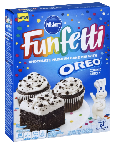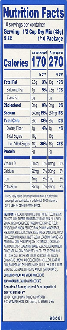 Ingredients: Enriched Bleached Wheat Flour (Wheat Flour, Niacin, Reduced Iron, Thiamin Mononitrate, Riboflavin, Folic Acid), Sugar, Oreo Cookie Pieces (Unbleached Enriched Flour [Wheat Flour, Niacin, Reduced Iron, Thiamine Mononitrate, Riboflavin, Folic Acid], Sugar, Palm And/Or Canola Oil, Cocoa Processed With Alkali, Invert Sugar, Leavening [Baking Soda And/Or Calcium Phosphate], Soy Lecithin, Salt, Chocolate, Natural Flavor), Cocoa Processed With Alkali, Leavening (Baking Soda, Calcium Phosphate, Sodium Aluminum Phosphate), 2% Or Less Of: Canola Oil, Corn Starch, Salt, Mono- And Diglycerides, Natural And Artificial Flavors, Cellulose, Cellulose Gum, Xanthan Gum, Sodium Stearoyl Lactylate, Citric Acid And Bht (Antioxidants)