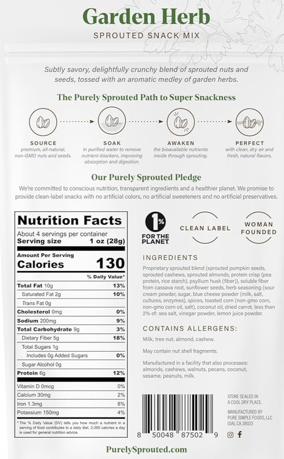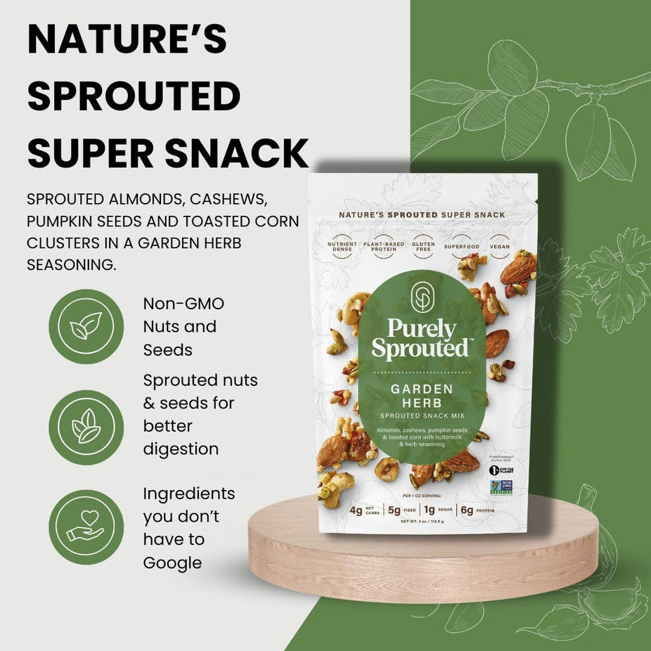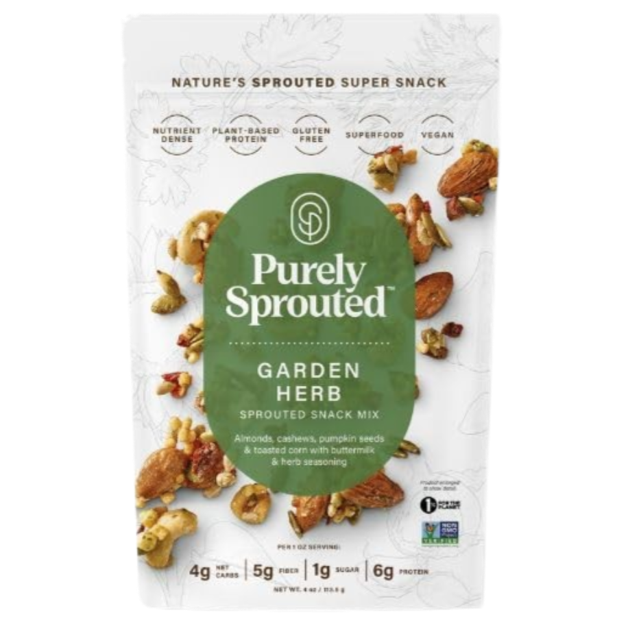 Purely Sprouted is dedicated to crafting nutrient-rich, flavorful snacks using high-quality, sprouted ingredients. Garden Herb Sprouted Snack Mix is a deliciously crunchy blend of almonds, cashews, pumpkin seeds, and toasted corn, perfectly seasoned with savory buttermilk and herbs.
