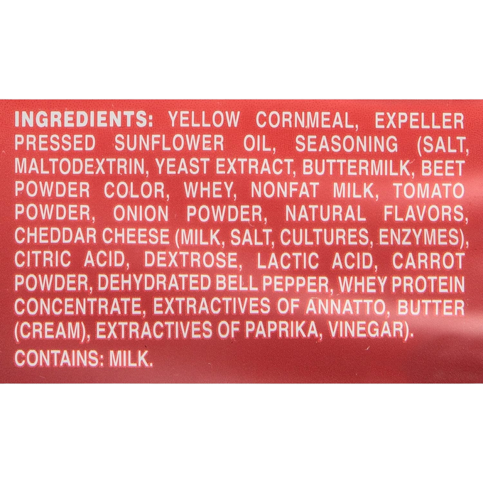 Ingredients: Yellow Cornmeal, Expeller Pressed Sunflower Oil, Seasoning (Salt, Maltodextrin, Yeast Extract, Buttermilk, Beet Powder Color, Whey, Nonfat Milk, Tomato Powder, Onion Powder, Natural Flavors, Cheddar Cheese (Milk, Salt, Cultures, Enzymes), Citric Acid, Dextrose, Lactic Acid, Carrot Powder, Dehydrated Bell Pepper, Whey Protein Concentrate, Extractives of Annatto, Butter (Cream), Extractives of Paprika, Vinegar).