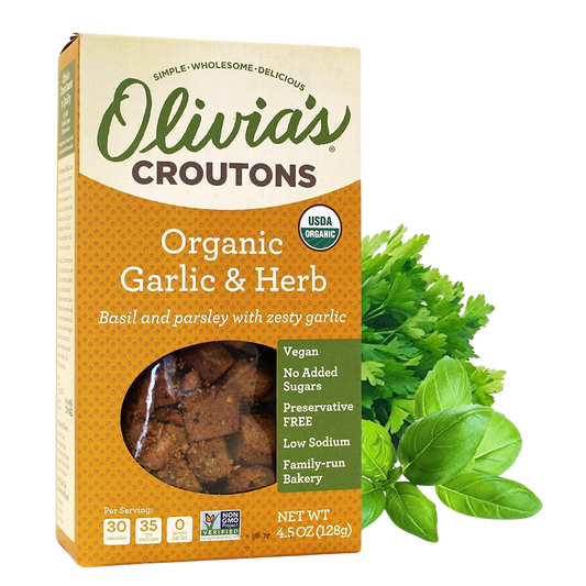 Ingredients: Organic Bread (Organic White Wheat Flour, Organic Whole Wheat Flour, Organic Rye Flour, Yeast, Sea Salt) Organic Sunflower Oil, Organic Granulated Garlic, Organic Granulated Onion, Organic Basil, Organic Black Pepper, Organic Paprika, Organic Parsley.