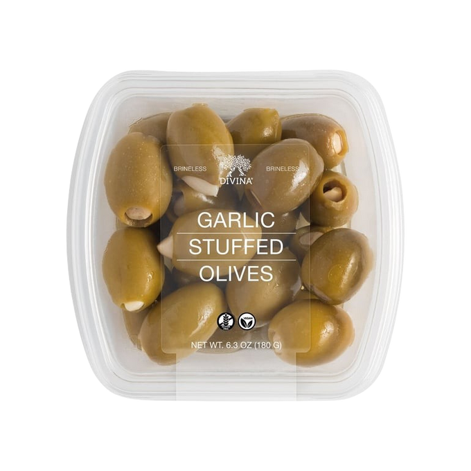 Savor the artisanal craftsmanship and vibrant flavors of Divina Garlic Stuffed Green Olives.