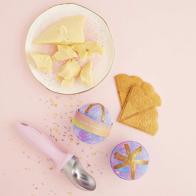 A warming vegan milk and honey scented bath ball that will gently foam away in the bath, creating swirls of violet, blue, pink and a little yellow, with a golden-bronze drizzle finish. Rich in cocoa butter, this bath ball is also a delicious treat for your skin.