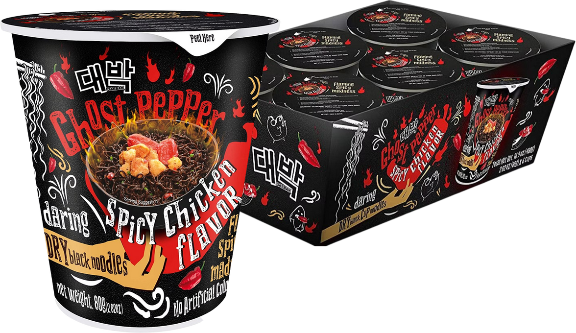 Ingredients: Wheat Flour (Contains Gluten), Palm Oil (Contains Permitted Antioxidant Butylated Hydroxytoluene), Tapioca Starch, Potato Starch, Cocoa Powder, Salt, Vegetable Concentrate (Carrot, Hibiscus, Maltodextrine, Citric Acid), Contains Stabilisers Sodium Polyphosphates, Potassium Carbonate And Guar Gum As Permitted Food Conditioner. Seasoning Sauce: Water, Sugar, Spices (Garlic Powder, Chili Powder, Ghost Pepper Powder), Contains Permitted Flavouring Substances [Chicekn Flavour Powder, Roasted Meat Flavour (Contains Soybean),, Sesame Oil (Contains Sesame)], Contains Monodosium Glutamate, Disodium5'-Guanylate And Disodium 5' - Inosinate As Permitted Flavour Enhancers, Hydrolysed Vegetable Protein (Contains Soybean), Korean Hot Sauce, Yeast Extract, Salt, Glycine, Maltodextrin, Contains Stabiliser Guar Gum And Acidity Regulatoer Citric Acid As Permitted Food Conditioner, Sucralose.