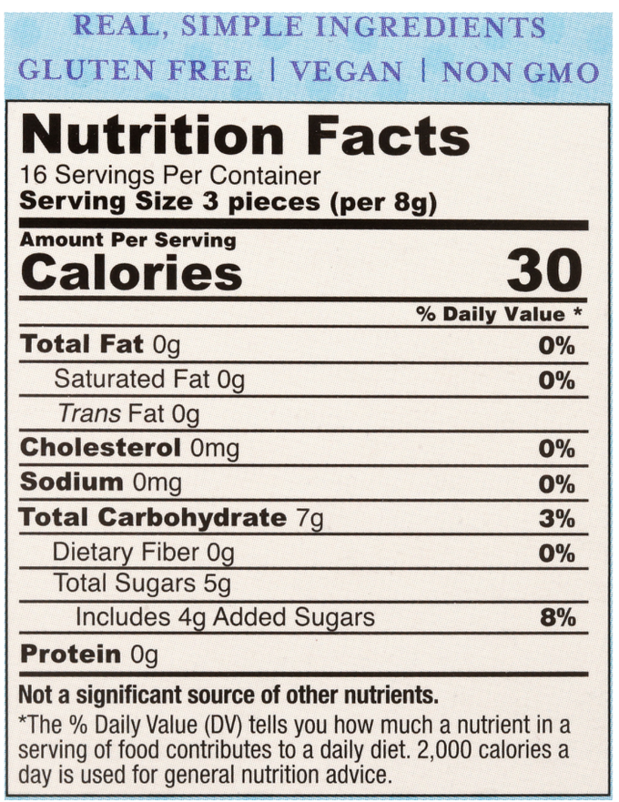 Ingredients: cane sugar, glucose syrup, ginger 30%, modified cassava starch, non-hydrogenated palm kernel oil (trans fat free), salt, soy lecithin Made in facility with peanuts and contains soy