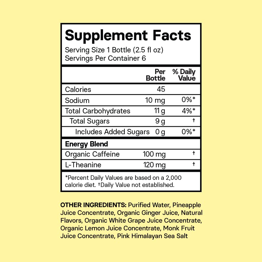 Ingredients: Purified Water, Pineapple Juice Concentrate, Organic Ginger Juice, Natural Flavors, Organic White Grape Juice Concentrate, Organic Lemon Juice Concentrate, Monk Fruit Juice Concentrate, Pink Himalayan Sea Salt