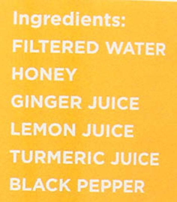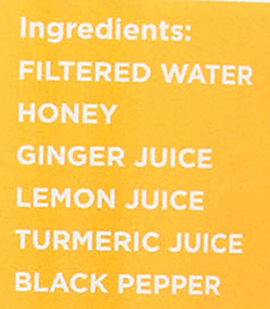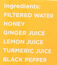 Ingredients: Filtered Water Honey Ginger Juice Lemon Juice Turmeric Juice Black Pepper