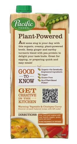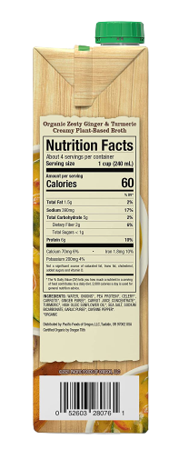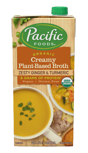 Ingredients: Water, Onions*, Pea Protein*, Celery*, Carrots*, Ginger Puree*, Carrot Juice Concentrate*, Turmeric*, High Oleic Sunflower Oil*, Sea Salt, Sodium Bicarbonate, Garlic Puree*, Cayenne Pepper*. *Organic