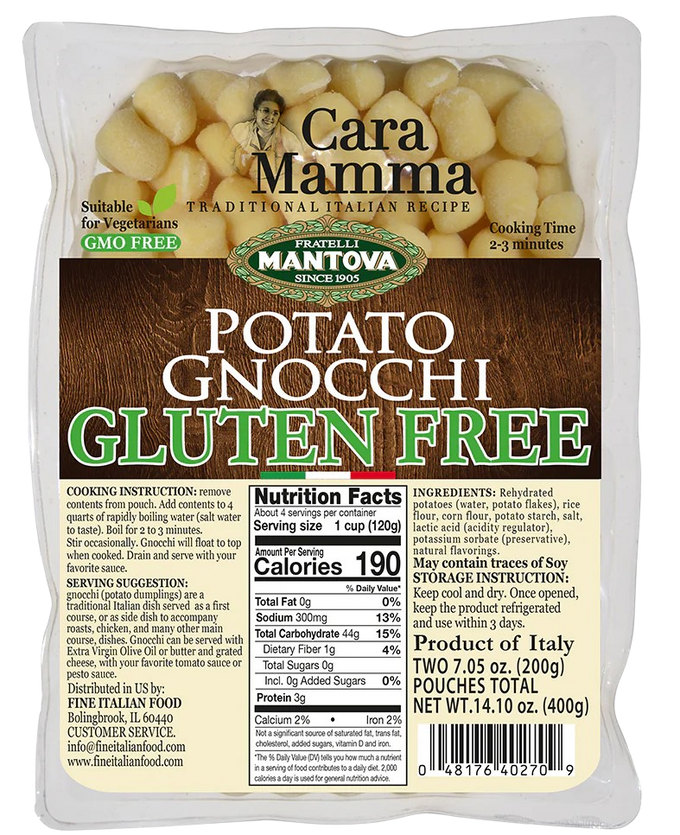 Mantova Gluten-Free Potato Gnocchi are traditional, potato dumplings made in Italy with all-natural, high-quality ingredients, including potatoes, rice flour, corn flour, potato starch, salt, and more. With a subtle, mild flavor, its soft, smooth texture, ridged shape, and excellent absorption ability, our Gluten-Free Potato Gnocchi will make any pasta dish simply delicious. No matter how you choose to enjoy them, the subtle, mild flavor and soft texture of our Gluten-Free Potato Gnocchi will surely satisfy you! Buon appetito!