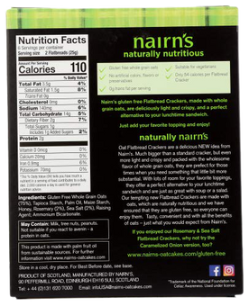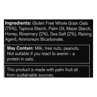 Ingredients: Gluten Free Whole Grain Oats (75%), Tapioca Starch, Palm Oil, Maize Starch, Honey, Rosemary (2%), Sea Salt (2%), Raising Agent; Ammonium Bicarbonate.