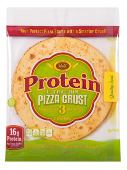 18 g Plant-based protein. 9 g total carbs per serving. Per Serving: 120 calories; 0 g sugars; 8 g net carbs; 300 mg sodium. How to Calculate Net Carbs: Total carbohydrates less the total dietary fiber provides total net carbs. 9 grams of total carbs less 1 gram dietary fiber = 8 grams net carbs. Non-GMO Project verified. nongmoproject.org. Your perfect pizza starts with a smarter crust! You pick the toppings. Leave the crust to us. Build a guilt-free pizza that's right for your personal goals and tasters! Trying to increase your protein and limit your carbohydrates? One Golden Home Protein Pizza Crust delivers 18g of high quality protein and only 9 g carbs.