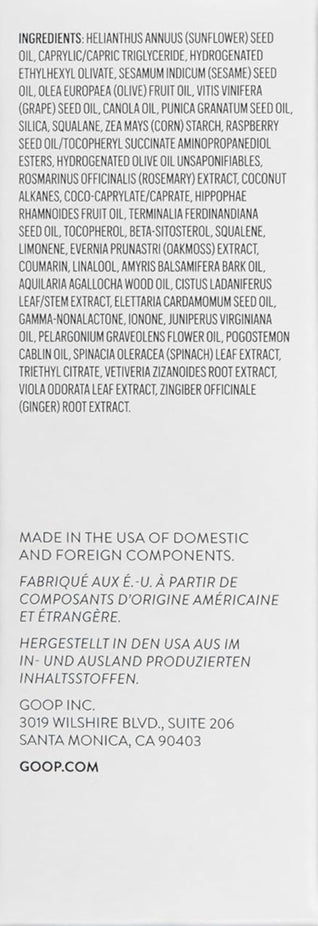 Ingredients: Helianthus Annuus (Sunflower) Seed Oil, Caprylic/Capric Triglyceride, Hydrogenated Ethylhexyl Olivate,sesamum Indicum (Sesame) Seed Oil,olea Europaea (Olive) Fruit Oil, Vitis Vinifera (Grape) Seed Oil, Canola Oil, Punica Granatum Seed Oil, Silica, Squalane, Zea Mays (Corn) Starch, Raspberry Seed Oil/Tocopheryl Succinate Aminopropanediol Esters, Hydrogenated Olive Oil Unsaponifiables, Rosmarinus Officinalis (Rosemary) Extract, Coconut Alkanes, Coco-caprylate/Caprate, Hippophae Rhamnoides Fruit Oil, Terminalia Ferdinandiana Seed Oil, Tocopherol, Beta-sitosterol, Squalene, Limonene, Evernia Prunastri (Oakmoss) Extract, Coumarin, Linalool, Amyris Balsamifera Bark Oil, Aquilaria Agallocha Wood Oil, Cistus Ladaniferus Leaf/Stem Extract, Elettaria Cardamomum Seed Oil, Gamma-nonalactone, Ionone, Juniperus Virginiana Oil, Pelargonium Graveolens Flower Oil, Pogostemon Cablin Oil, Spinacia Oleracea (Spinach) Leaf Extract, Triethyl Citrate, Vetiveria Zizanoides Root Extract, Viola Odorata Leaf Extract, Zingiber Officinale (Ginger) Root Extract.