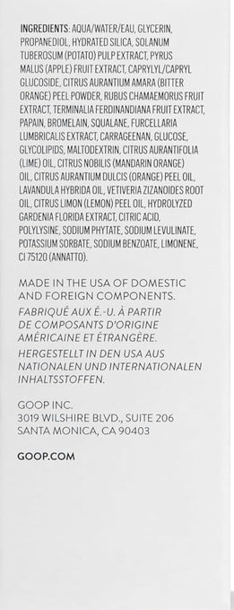 Ingredients: Aqua/Water/Eau, Glycerin, Propanediol, Hydrated Silica, Solanum Tuberosum (Potato) Pulp Extract, Pyrus Malus (Apple) Fruit Extract, Caprylyl/Capryl Glucoside, Citrus Aurantium Amara (Bitter Orange) Peel Powder, Rubus Chamaemorus Fruit Extract, Terminalia Ferdinandiana Fruit Extract, Papain, Bromelain, Squalane, Furcellaria Lumbricalis Extract, Carrageenan, Glucose, Glycolipids, Maltodextrin, Citrus Aurantifolia (Lime) Oil, Citrus Nobilis (Mandarin Orange) Oil, Citrus Aurantium Dulcis (Orange) Peel Oil, Lavandula Hybrida Oil, Vetiveria Zizanoides Root Oil, Citrus Limon (Lemon) Peel Oil, Hydrolyzed Gardenia Florida Extract, Citric Acid, Polylysine, Sodium Phytate, Sodium Levulinate, Potassium Sorbate, Sodium Benzoate, Limonene, Annatto / CI 75120.