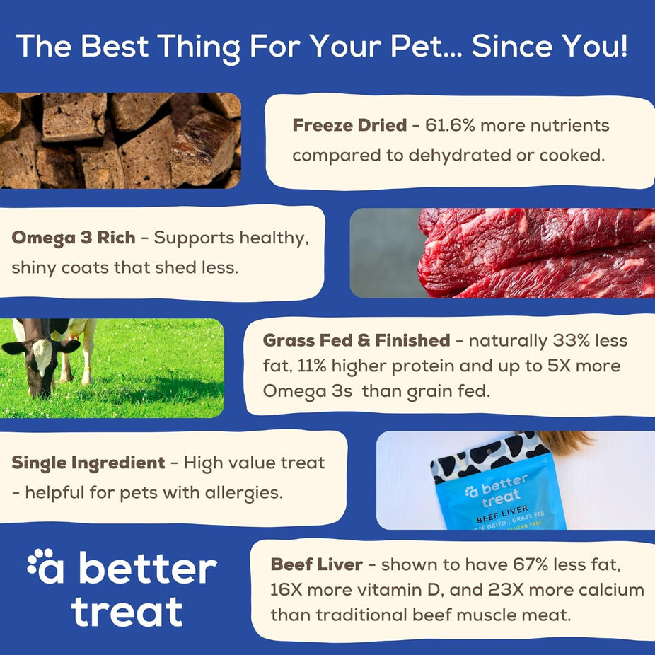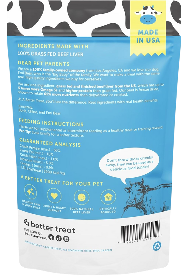 A Better Treat Grass Fed Beef Liver Dog & Cat Treats are single-ingredient, freeze-dried rewards made to nourish and delight.