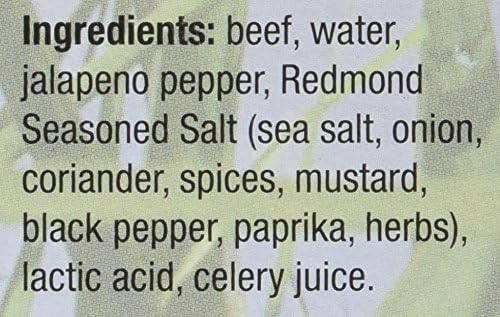 Ingredients: Grass-fed Beef, Water, Jalapeño Pepper, Redmond Seasoned Salt (Sea Salt, Spices [including Coriander, Black Pepper, Celery, Mustard, Parsley, Paprika, Turmeric], Garlic, Onion), Encapsulated Lactic Acid, Cultured Celery Powder (Celery Powder, Sea Salt).