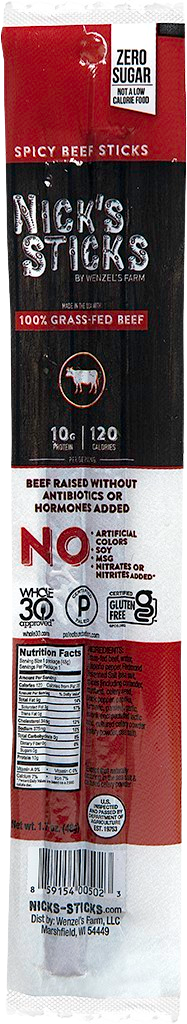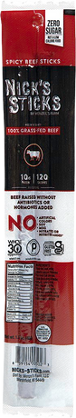 Nick’s Sticks Grass Fed Spicy Beef Stix are made from premium grass-fed beef, delivering a nutritious and flavorful protein-packed snack with a kick of spice.